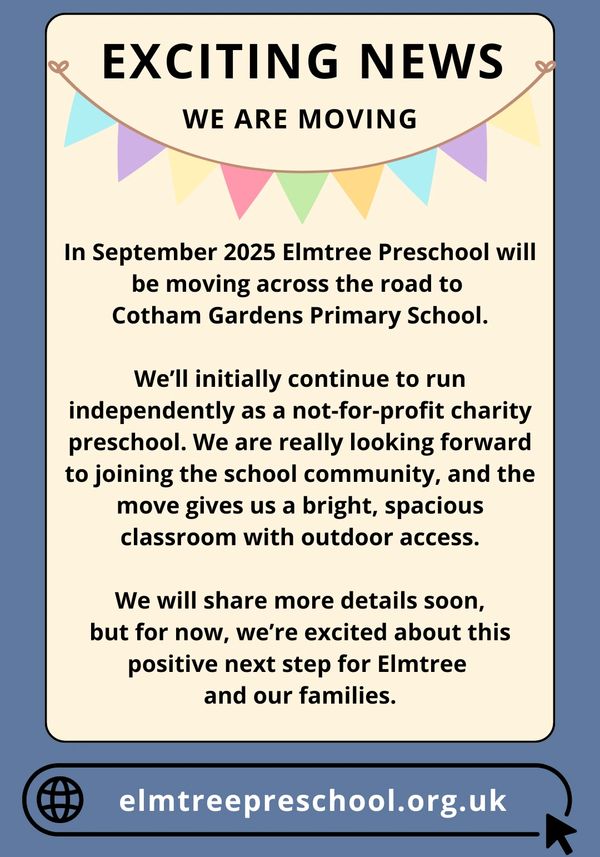 WE HAVE MOVED ACROSS THE ROAD TO COTHAM GARDENS PRIMARY SCHOOL (ELMGROVE SITE)