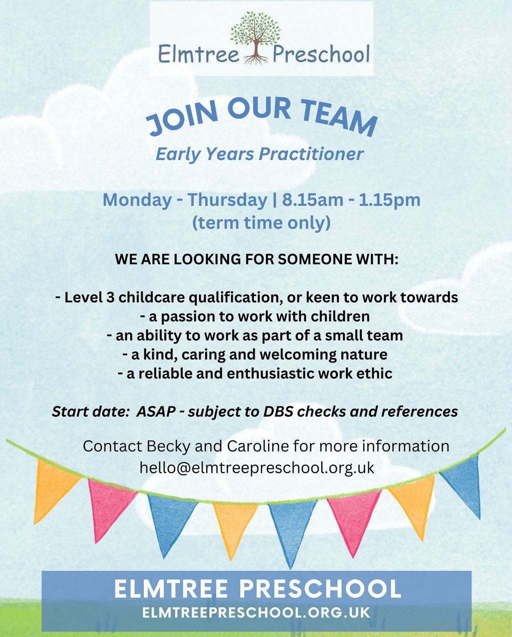 If you'd be interested in a part time position at Elmtree Preschool please do get in touch with Becky and Caroline via hello@elmtreepreschool.org.uk or the contact form below. We look forward to hearing from you!